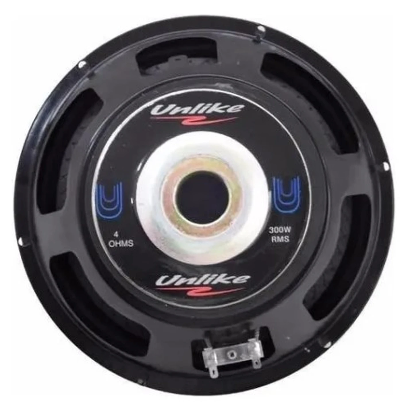 Alto falante 10" Unlike Subwoofer UNF103 BS produz 300w Rms, seu cone de celulose é feito com fibra de vidro, formado a vácuo, difusor de alumínio, bobina de quatro camadas duplas, corpo de alumínio resistente a altas temperaturas, borda de borracha costurada, centragem progressiva, polo ventilado e alto deslocamento.